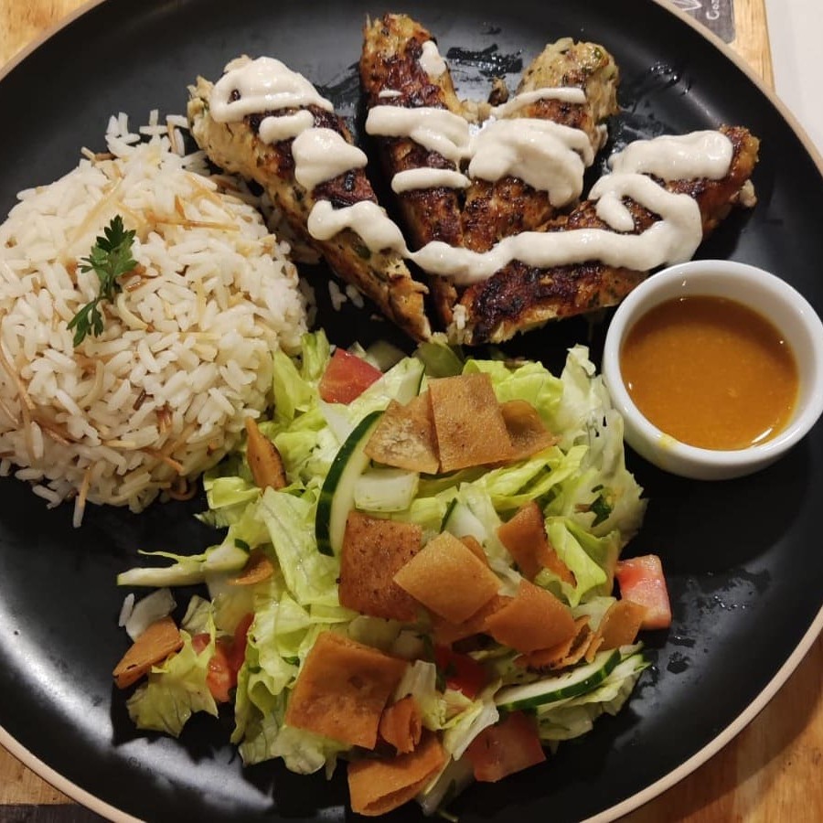 100 g de frango grelhado com coalhada e legumes, acompanhado de mix de salada e molho com especiarias árabes !