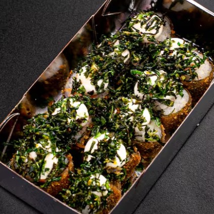 Este prato de '10 Jhou Salmão Maçaricado com Couve Crispy' é uma verdadeira obra-prima da culinária japonesa. Feito com pedaços generosos de salmão fresco e suculento, maçaricado à perfeição para realçar o seu sabor rico e profundo. Acompanha cream cheese cremoso e suave, acrescentando uma textura única e equilibrando a riqueza do peixe. O arroz shari, cozido na perfeição e delicadamente temperado, serve como base perfeita para este prato. Finalizado com toques de couve crispy, adicionando um contraste crocante ao prato. Cada mordida deste elegante uramaki e hossomaki é uma explosão de sabores inesquecíveis.