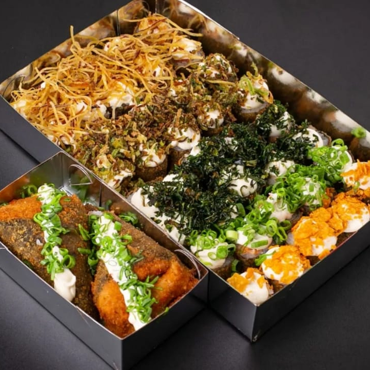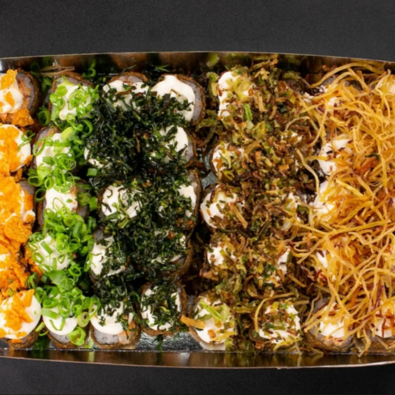 5 uramaki com Doritos, 5 uramaki com couve crispy, 5 uramaki com batata crispy, 5 uramaki com cream cheese e cebolinha