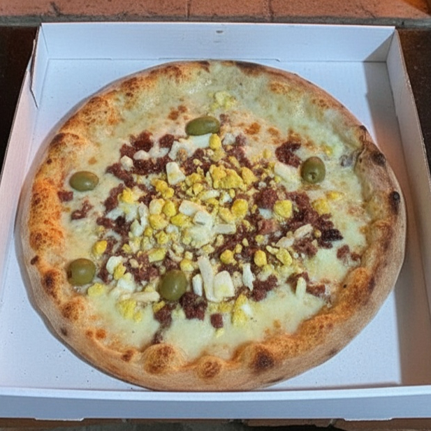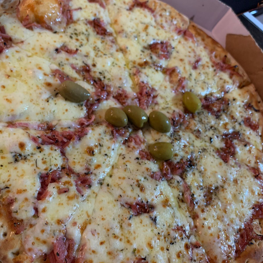 Calabresa moída, cebola, catupiry, mussarela e parmesão