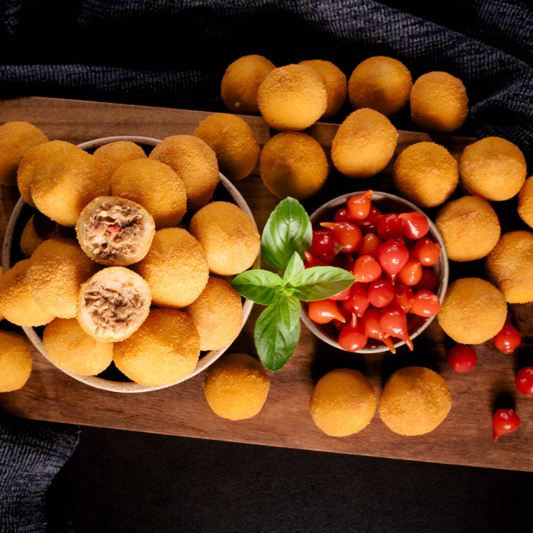 Deliciosas mini bolinhas congeladas e já fritas, com recheio cremoso de calabresa e requeijão (ou Catupiry) 😋. Produto prático: basta aquecer no forno ou airfryer. (Pacote de 1kg - apróx. 40 unidades)