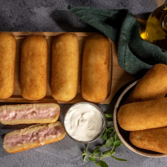 Deliciosos enroladinhos com massa de batata crocante e recheio farto de presunto e queijo 😋. Produto frito e congelado, pronto para aquecer no forno ou airfryer. Perfeito para lanches rápidos, festas ou aperitivos práticos.