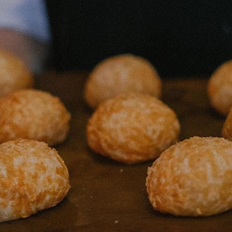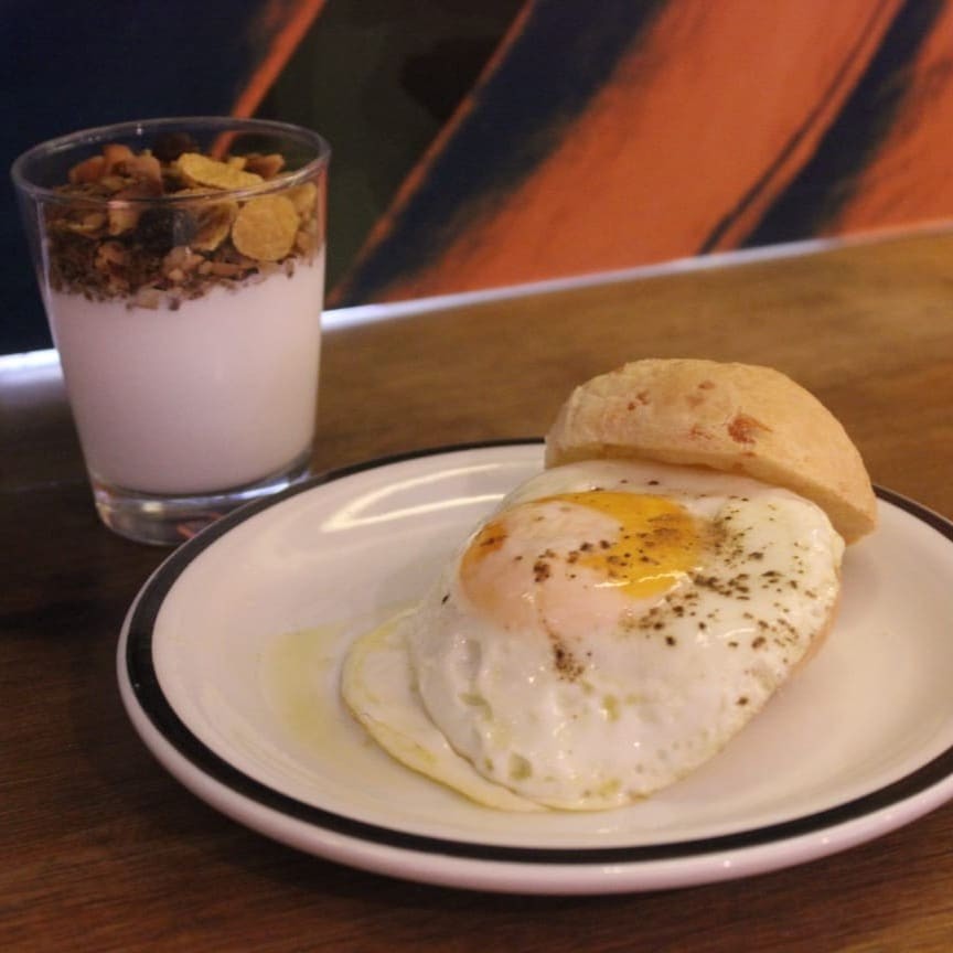 Pão de queijo com pernil desfiado e ovo estalado,Iogurte natural com granola Urbe + filtrado