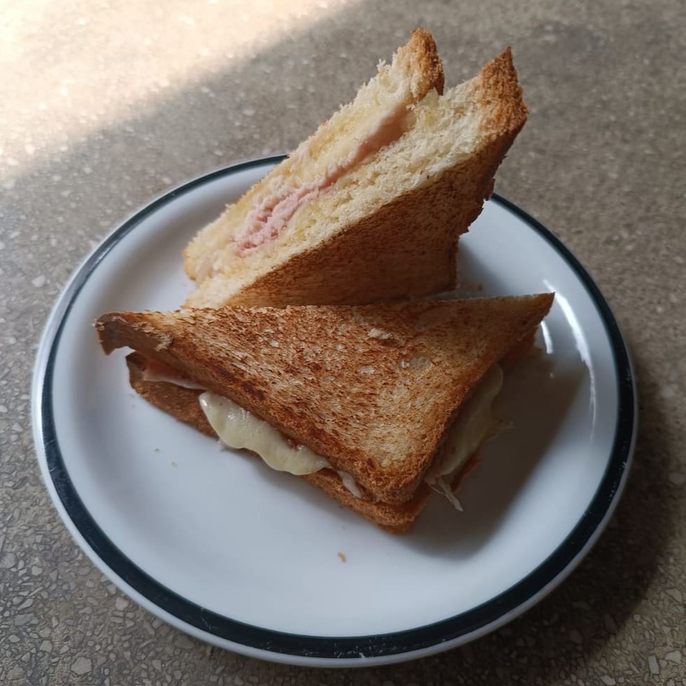 Queijo derretido e fatias finas de lombo defumado no pãoi de forma tipo brioche