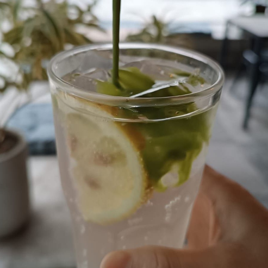 Matcha, Água Com Gás, xarope de limão siciliano.