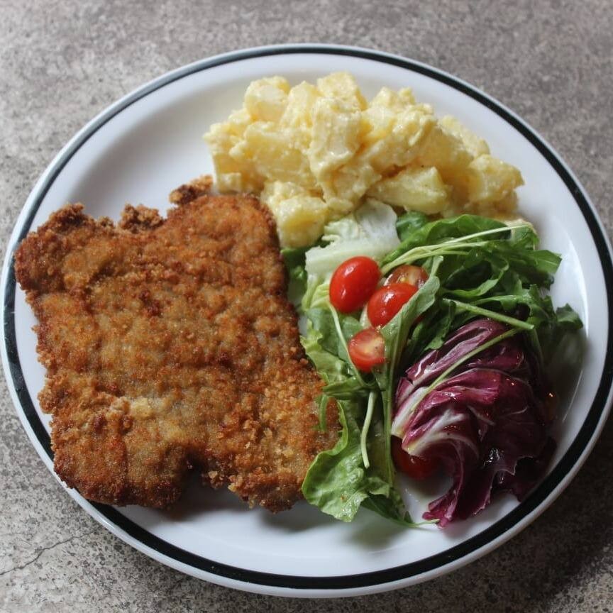 Peito de frango empanado, alface romana, croutons, lascas de queijo parmesão e molho do Cesar