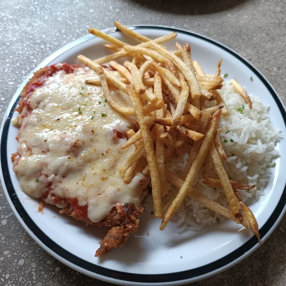 Acompanha arroz, feijão, fritas fininhas com páprica.