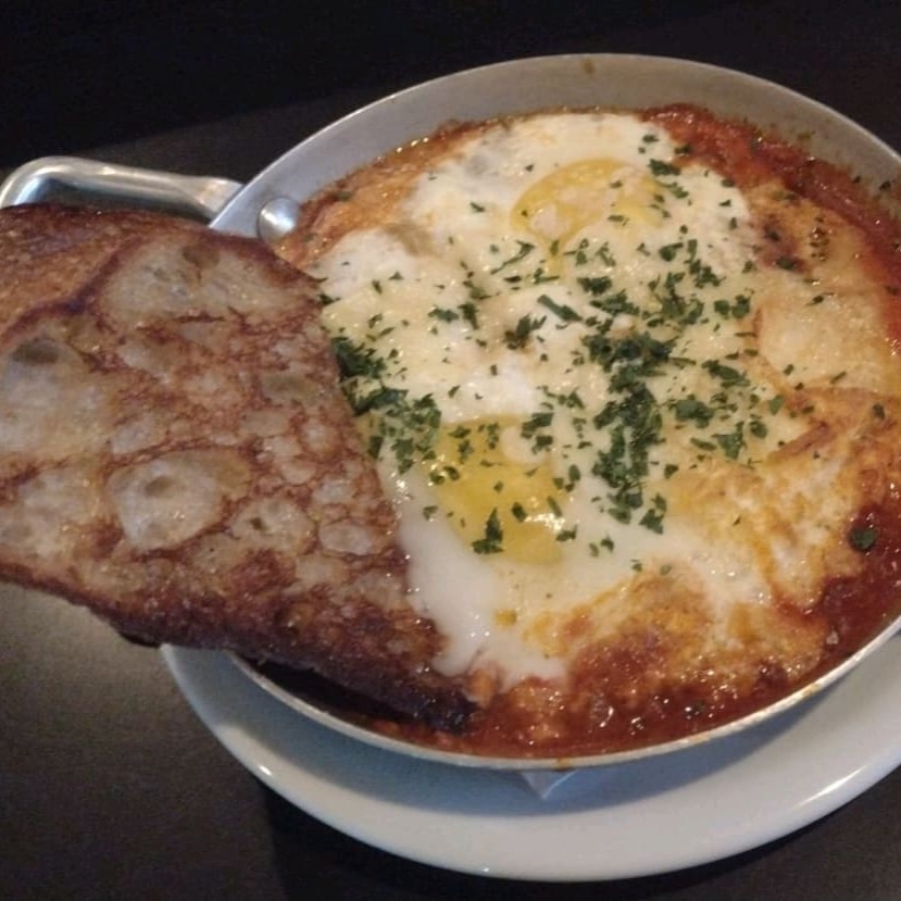 Ovos no molho de tomate e pimentões, acompanha fatia de pão