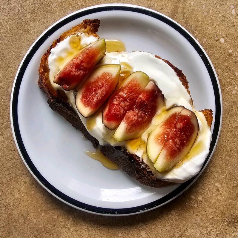 Pão de fermentação natural, queijo chevre, fatias de figo e mel