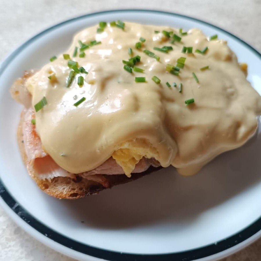 Pão de fermentação natural, ovos cremosos, fatia de lombo defumado e molho béarnaise.