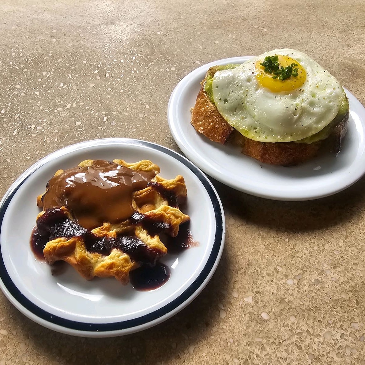 Pão de fermentação natural, pasta de abacate, tomate e ovo estalado. E ainda, Waflle(selecione seu preferido) + Filtradão