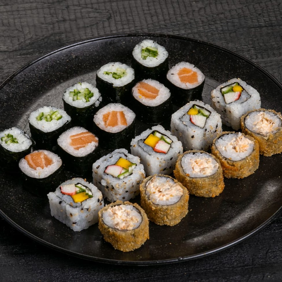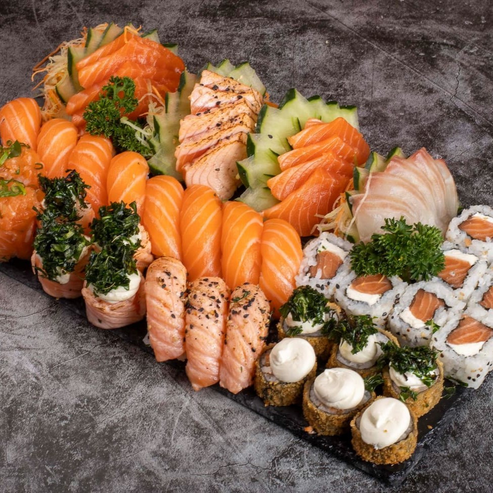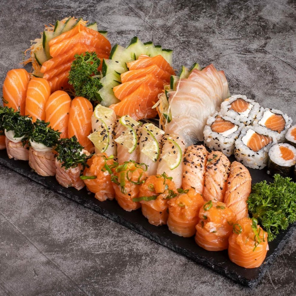 6 sashimi de salmão 5 jhou de salmão 5 niguiri de salmão 5 hossomaki de salmão 5 uramaki de salmão 5 uramaki califórnia 5 hossomaki pepino