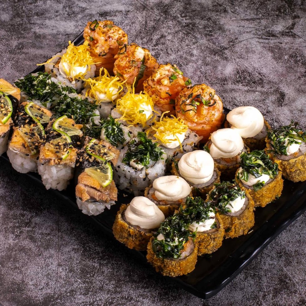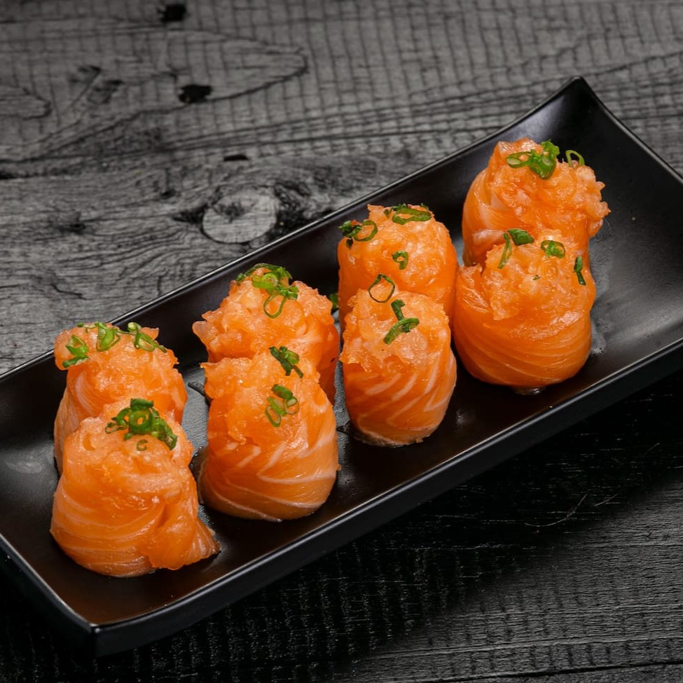 Laminas de salmão enrolado no shary, flambado no masarico. Atenção! Sem alteração.... Deixe sua avaliaçao no app sobre este pedido, sua 5 estrela vai ajudar bastante;)
