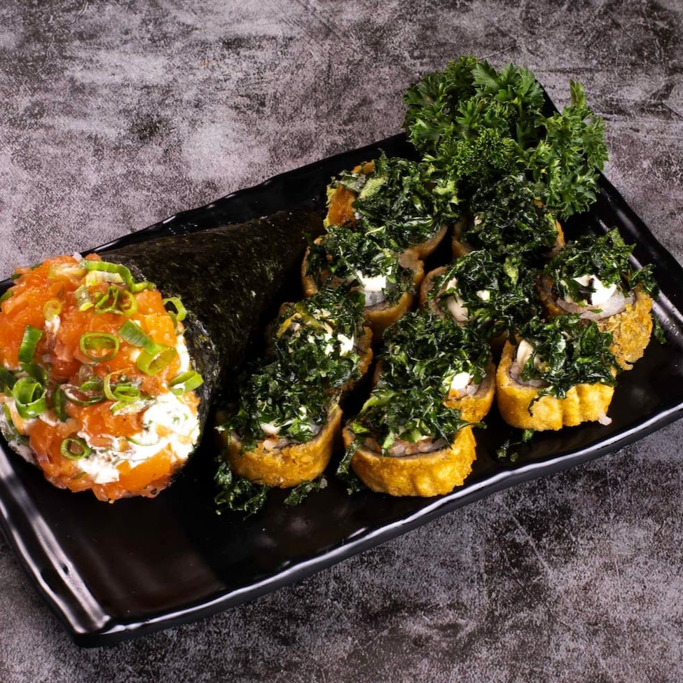 1 Temaki salmão completo 1 hot roll couve 8 unidades