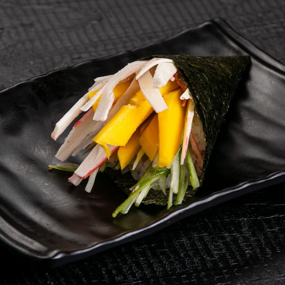 Arroz enrolado com recheio de manga,pepino e kani. Atenção! Sem alteração.... Deixe sua avaliaçao no app sobre este pedido, sua 5 estrela vai ajudar bastante;)