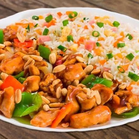 Frango xadrez frango em cubo cebola cenoura pimentão ao molho shoyu Yakimeshi arroz presunto cebolinha cenoura e ovo