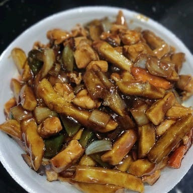 Frango cebola pimentão cenoura batata frita ao molho shoyu arroz yakimeshi