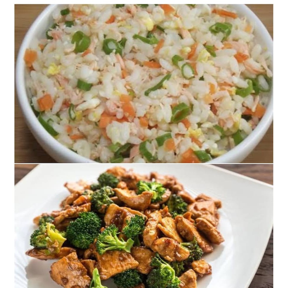 Frango brócolis cenoura pimentão ao molho shoyu Arroz cenoura presunto cebolinha e ovo