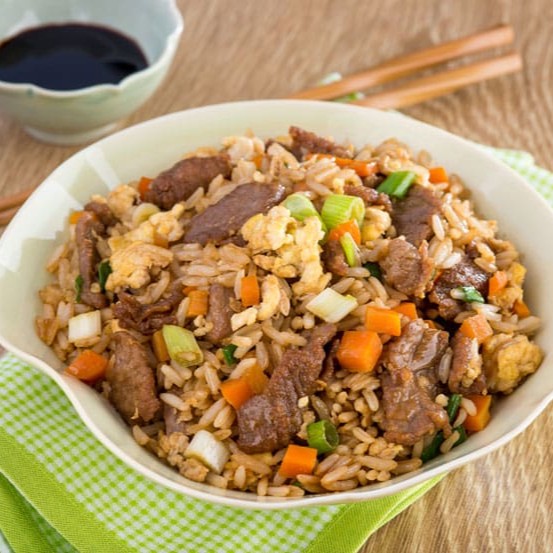 Carne fatiada arroz cebolinha cenoura ao shoyu