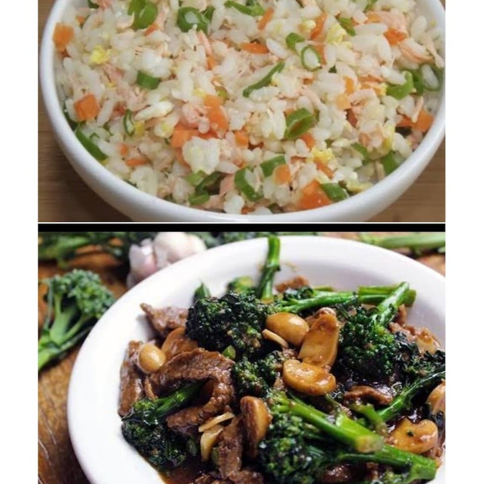 Carne brócolis cenoura e pimentão ao molho shoyu Arroz cenoura presunto cebolinha e ovo