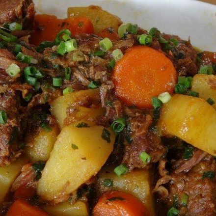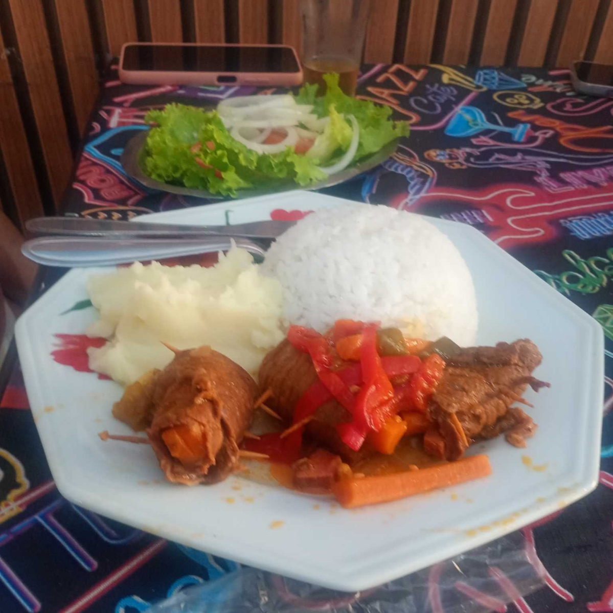 Arroz, carne cozida com batata e cenoura, salada