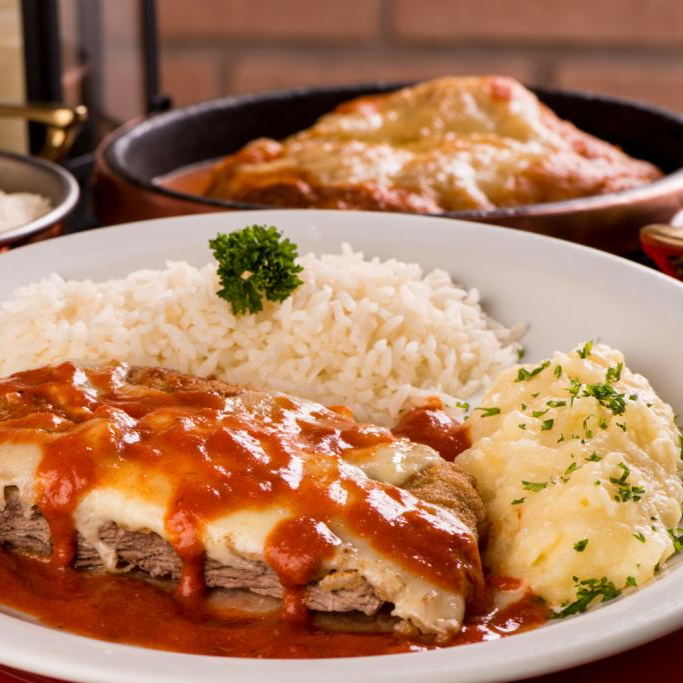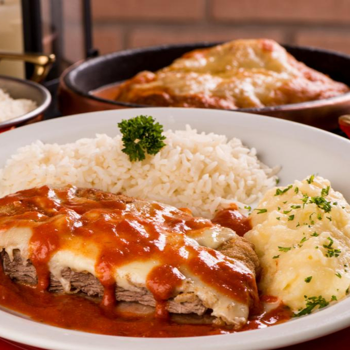 Filé Mignon à Parmegiana Arroz e purê