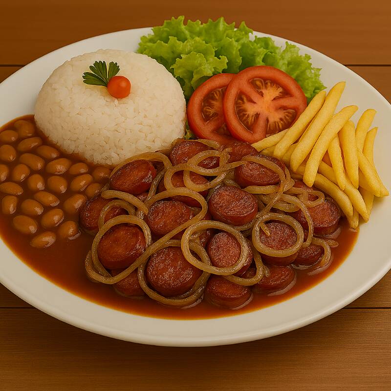 Calabresa, Arroz, feijão e fritas.
