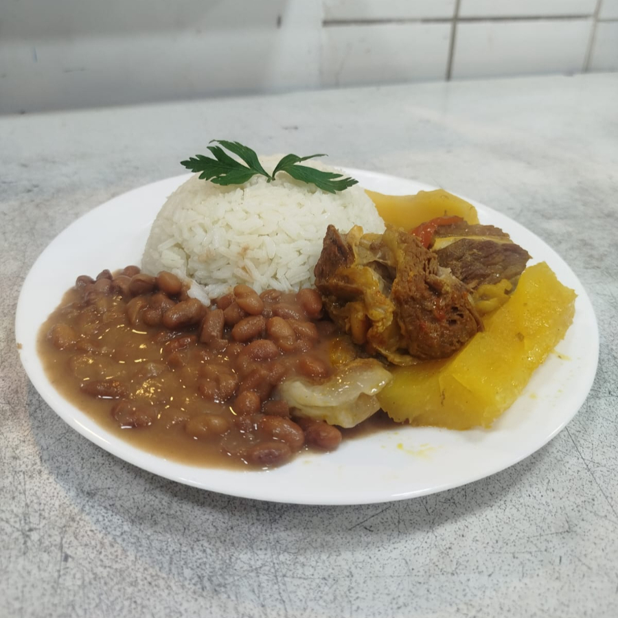 Feijoada, preparada com feijão preto de qualidade e carnes selecionadas, Arroz branco, farofa, couve, torresmo, banana empanada Serve 3 pessoas