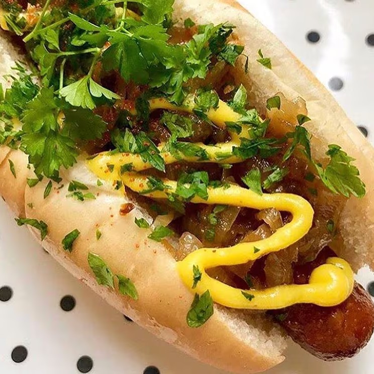 Salsicha vegan grelhada, cebolas carameladas no shoyu, mostarda de damasco e ervas frescas no pão de hot dog. atenção: não é possível alterar o prato. Contém glútem.