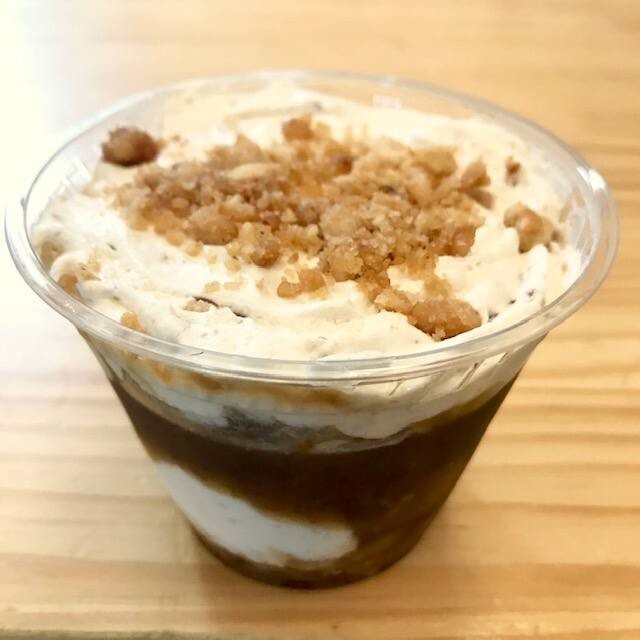Bananas carameladas, chantilly e pralinée de amendoim. Contém glúten.