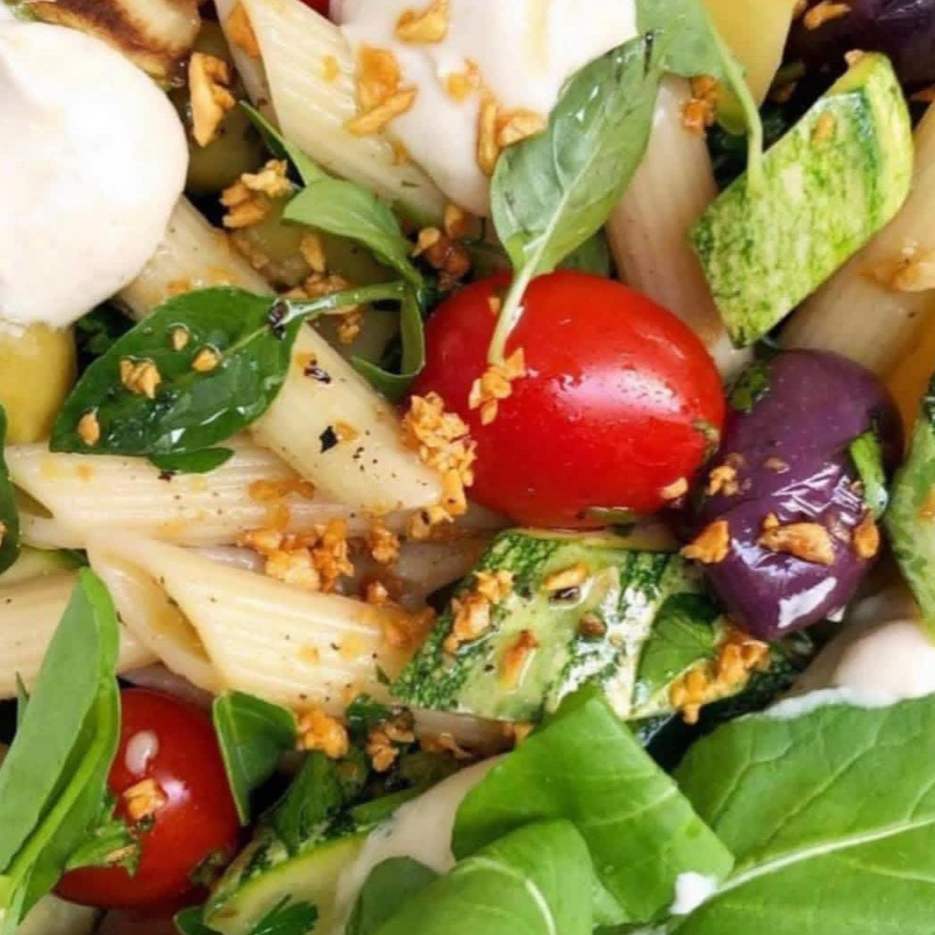 Para qualquer hora! Salada fria: Penne grano duro, tomate-cereja, queijo vegan de castanha de caju, rúcula, abobrinha no alho, azeitonas, manjericão fresco, azeite extra-virgem. Atenção: não é possível alterar o prato. Contém glúten.
