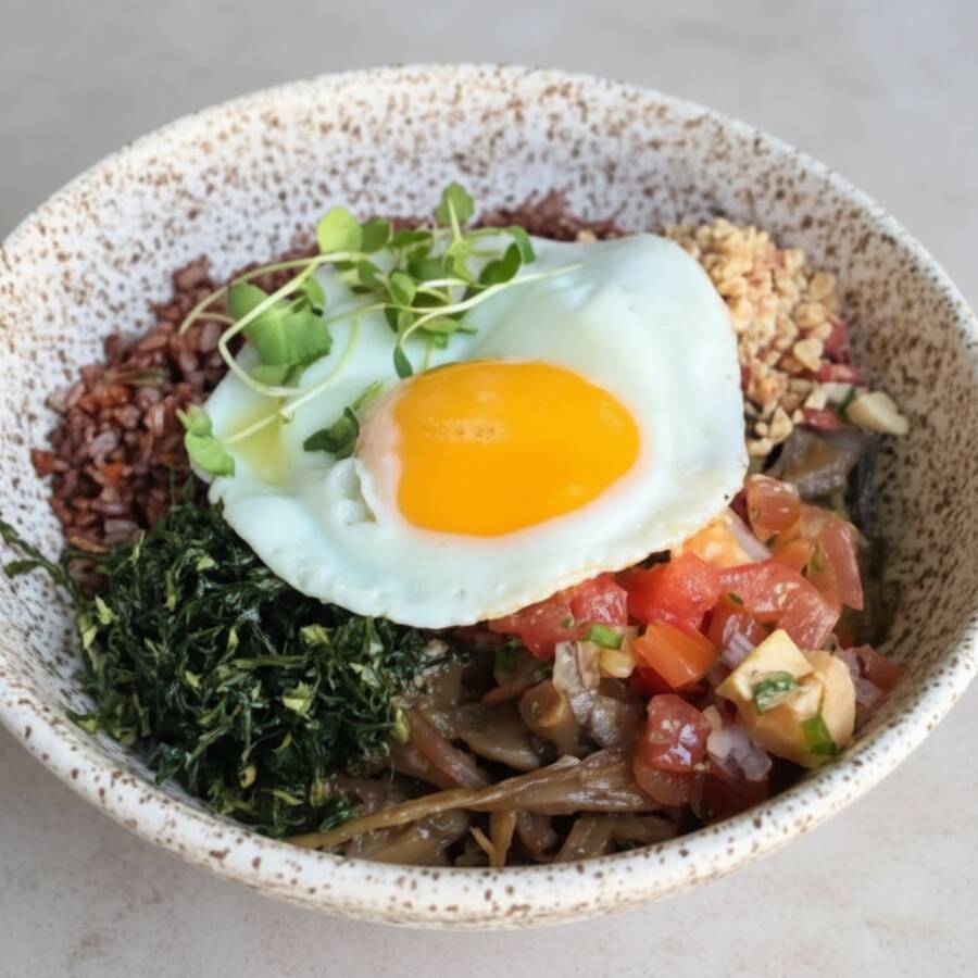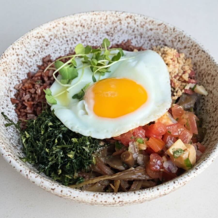 Aquele "Pf" completo e de respeito na versão vegetariana!! Picadinho de cogumelos temperadinhos, com arroz vermelho, vinagrete de banana-da-terra, couve crispy, farofa crocante de nuts e ovo estrelado (com gema mole). Comida de verdade que abraça sabe? Cogumelos | Picadinho de Cogumelos | Cogumelo | Ovo Frito | Prato Vegetariano | Vegetariano | Bowl Quente | Fit | Superfood | Comida de Verdade
