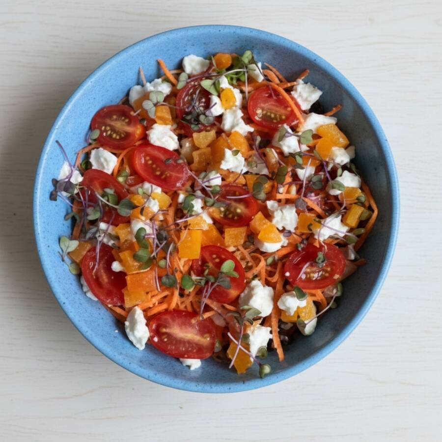Mix de folhas, queijo de cabra, damasco, cenoura, tomate cereja e mix de nuts. Escolha seu molho favorito! Sugestão de molho: mostarda e mel ou pesto. Salada | Saladas | Salada com Queijo | Damasco | Salada Vegetariana | Vegetariana | Nuts | Comida Saudável | Saudável | Comida de Verdade |