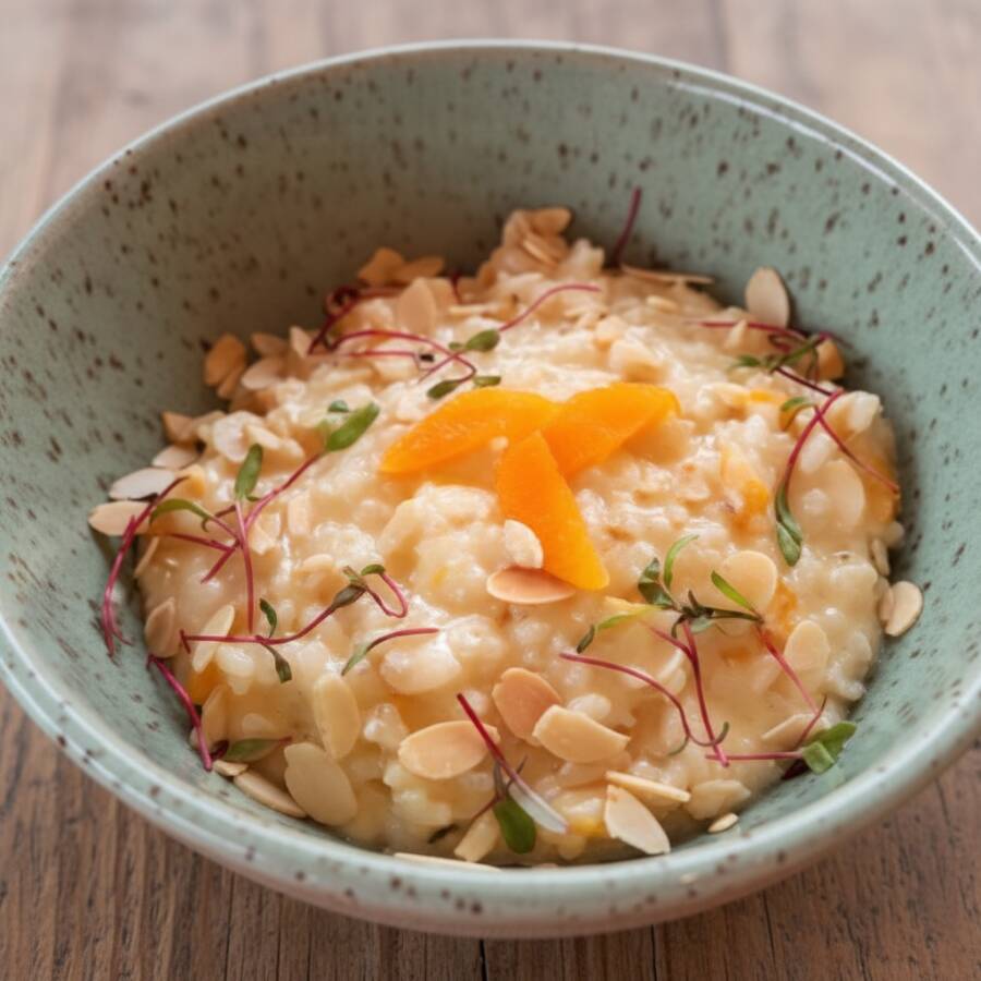Risoto cremoso feito com arbóreo, parmesão, mozzarella de búfala e damasco, finalizado com amêndoas laminadas. Para ficar ainda melhor, você pode adicionar uma proteína. comida italiana | risoto | risoto de damasco | risoto vegetariano | comida vegetariana | comfort food | queijo | damasco | risotto | risoto de queijos | comida saudável