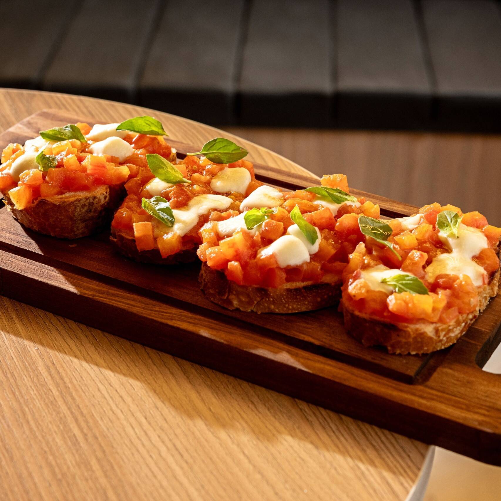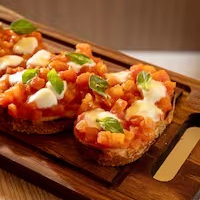 Fatias de pão italiano aquecidas, com tomate em cubos ao molho pomodoro, muçarela de búfala e manjericão.