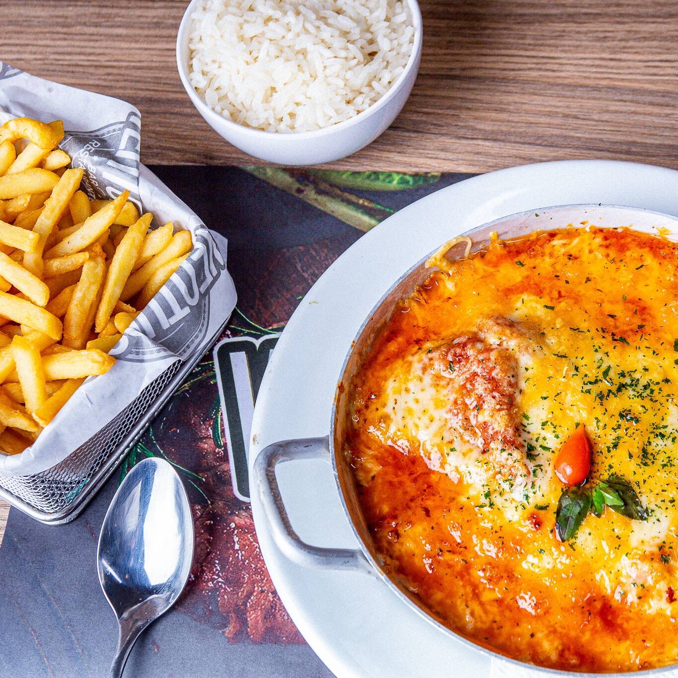 Acompanha arroz branco e fritas.