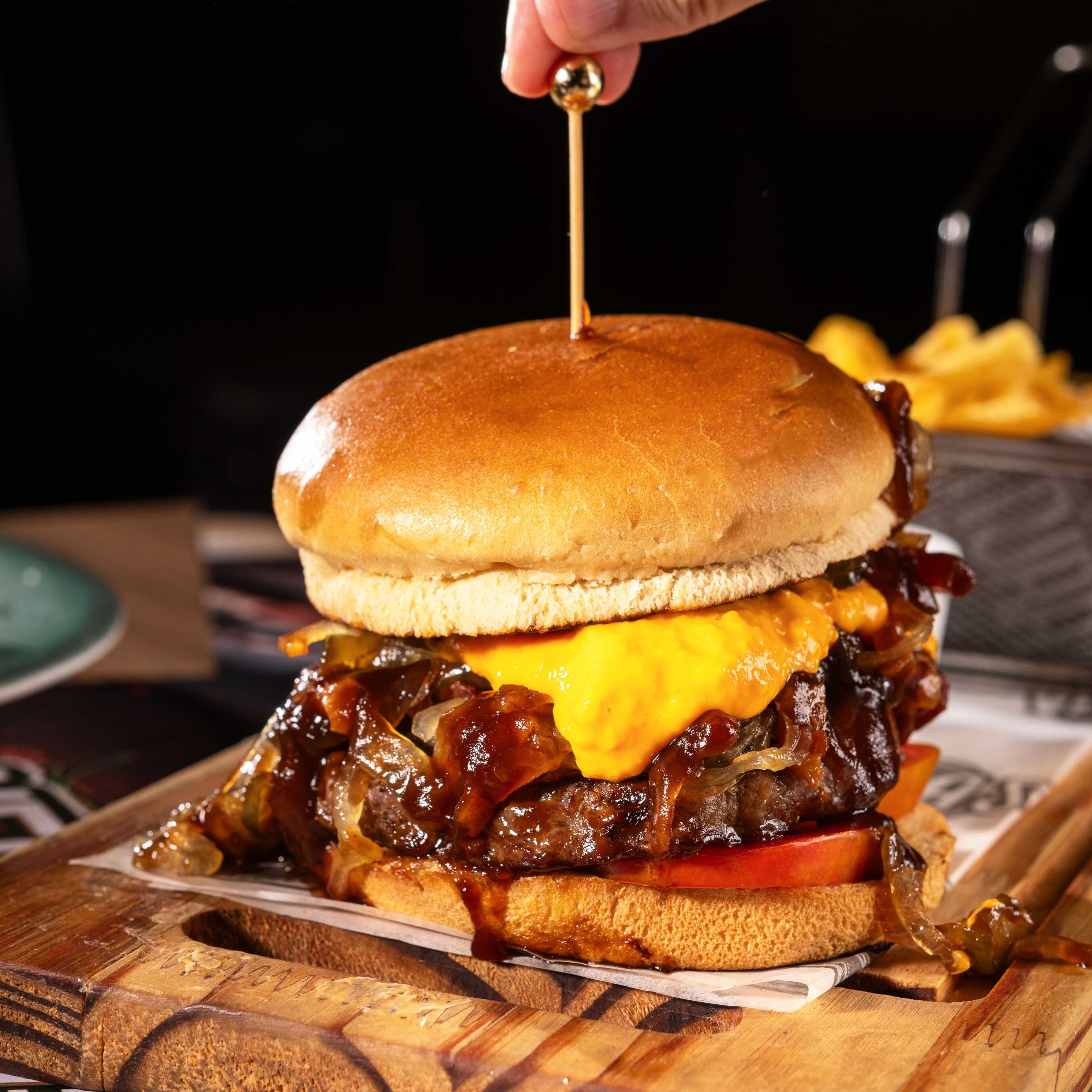 Pão brioche, blend picanha 200g, cheddar, tomate, picles com bacon, e cebola caramelizada. Acompanha maionese da casa.