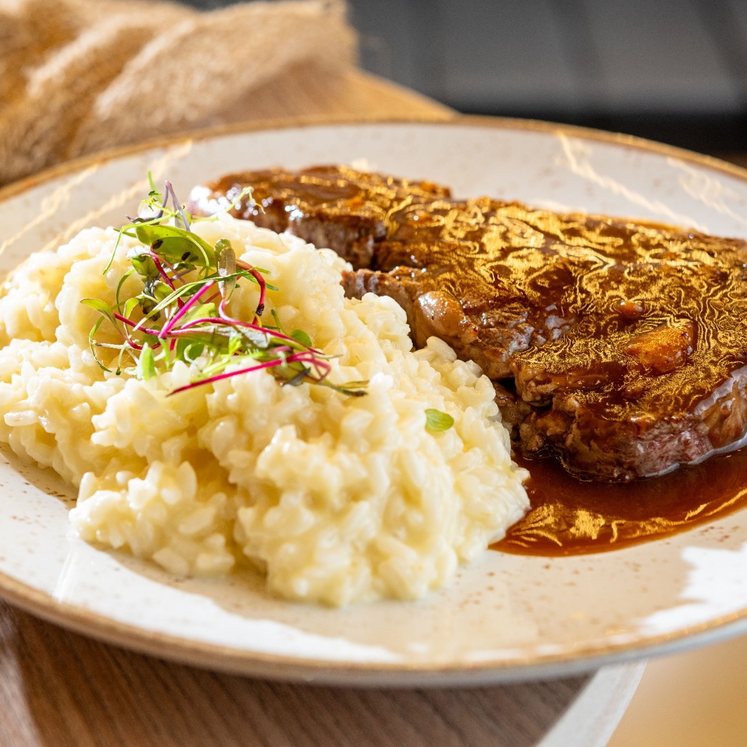 Corte alto do acho angus de 250g ao molho de cerveja preta. Acompanha risoto de parmesão