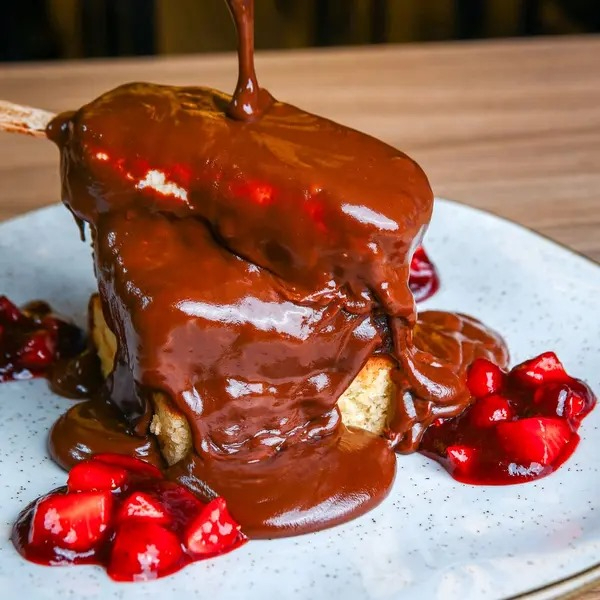 Gateau de chocolate, com picolé de baunilha, calda de chocolate, farofa de castanhas e morango.