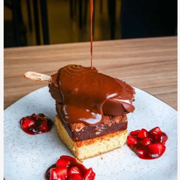 Brownie branco e preto com calda de frutas vermelhas e picolé de creme e calda de chocolate