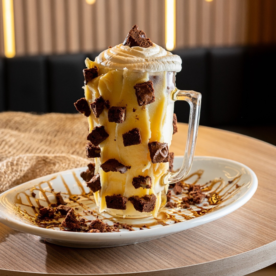Caneca coberta com brigadeiro de leite ninho, pedaços de brownie meio amargo com nozes. No interior, sorvete de creme com calda quente de chocolate, finalizado com chantily