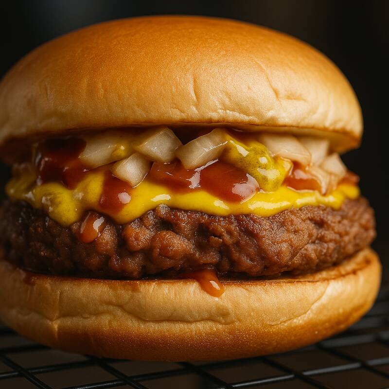 2 x burgers sabor carne feito com proteína de ervilha (não contém soja) + queijo tipo cheddar de castanha de caju + cebola + ketchup + mostarda + picles de pepino no pão de brioche selado na chapa!