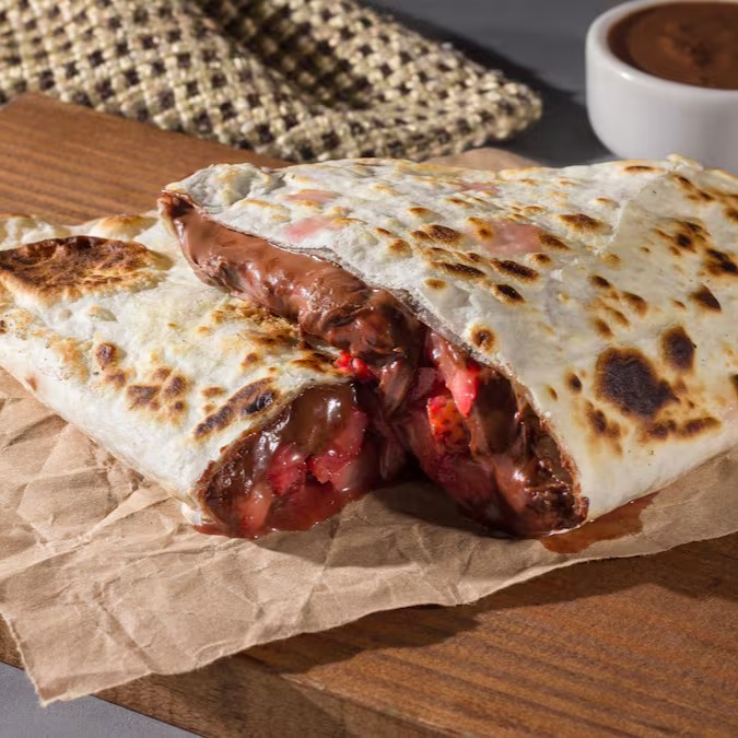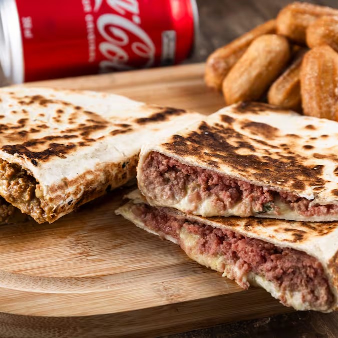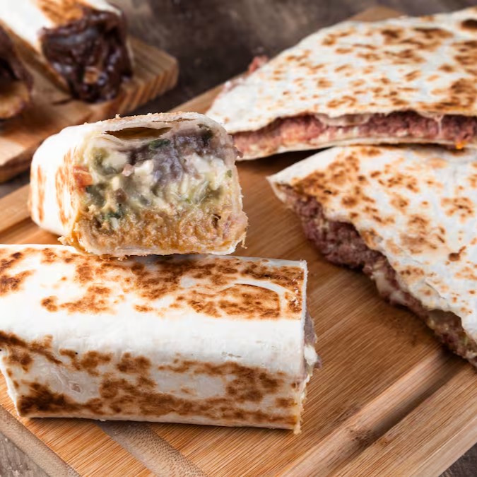 Delicioso prato típico mexicano, formado por uma grande tortilla de trigo levemente tostada, enrolada na forma de tubo, recheada com saborosa pasta de feijão, queijo derretido e os molhos mexicanos mais tradicionais ( sour cream E guacamole) dentro da tortilha