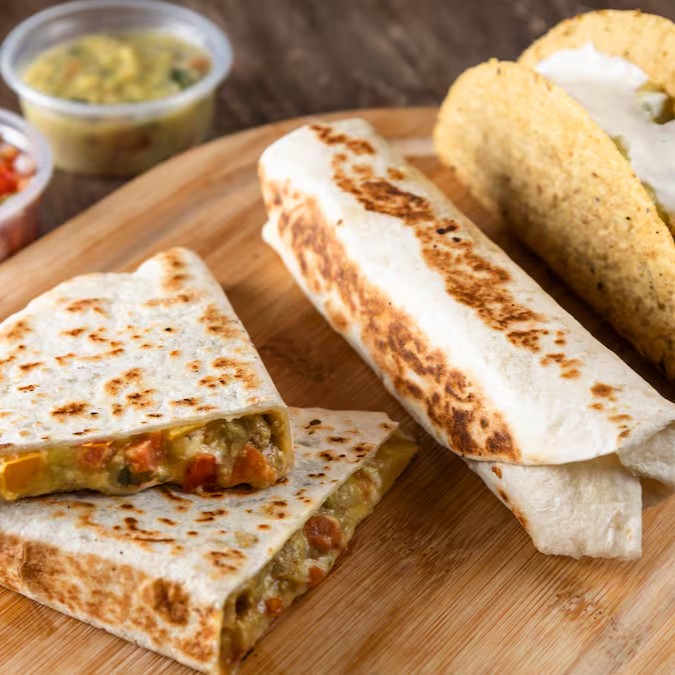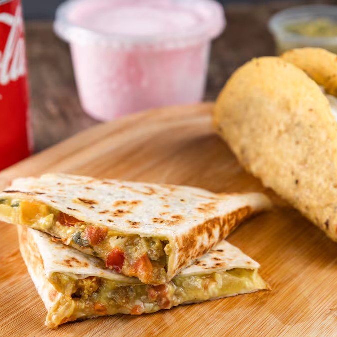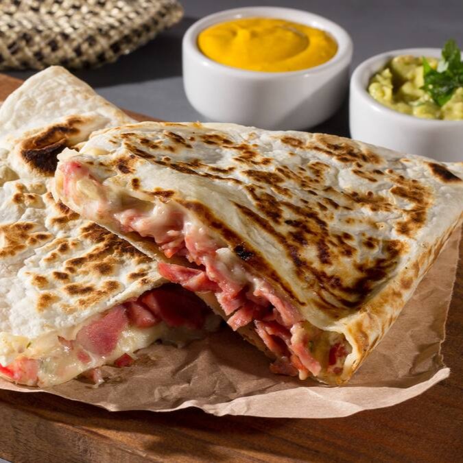 Delicioso prato típico mexicano, formado por uma tortilla de trigo levemente tostada, dobrada, recheada, fartas fatias de queijo derretido e os molhos mexicanos mais tradicionais ( sour cream e guacamole) dentro da tortilha.
