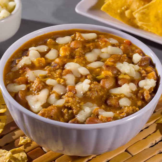 Porção de feijão com carne moída, temperados com ingredientes típicos da culinária mexicana. Acompanha porção de nachos (tortilhas). Sem os molhos.