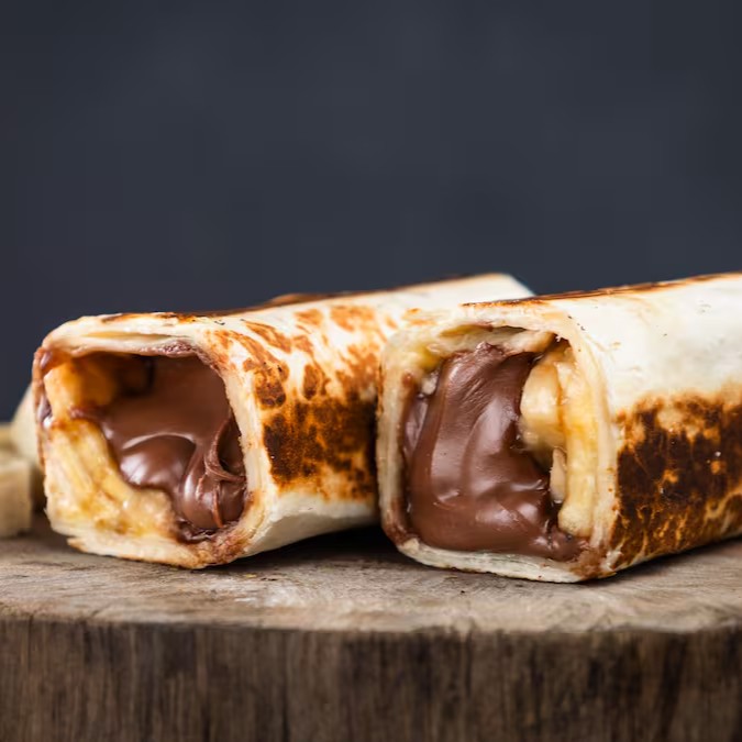 Massa de trigo fininha e levemente tostada, enrolada e recheada com os doces de sua preferência.