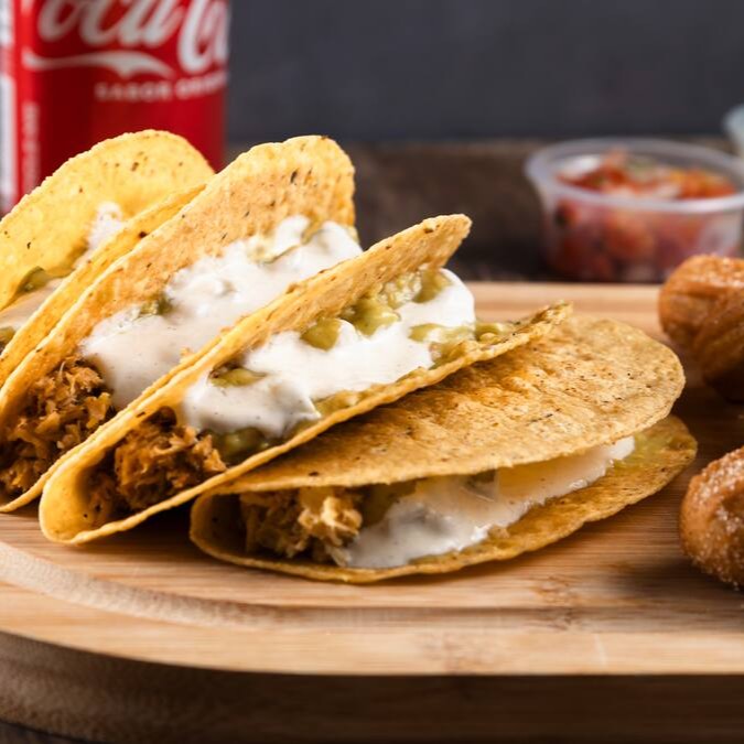 Dois Tacos com recheio a sua escolha, acompanham guacamole, soucream e salsa mexicana e a sua Coca Lata 330ml