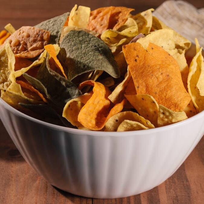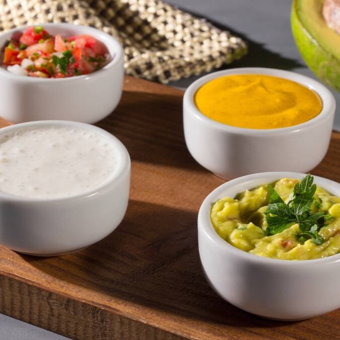 Salgadinhos crocantes feitos de milho. Acompanha dois molhos para você se deliciar (guacamole e sour cream)