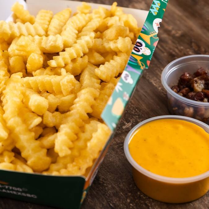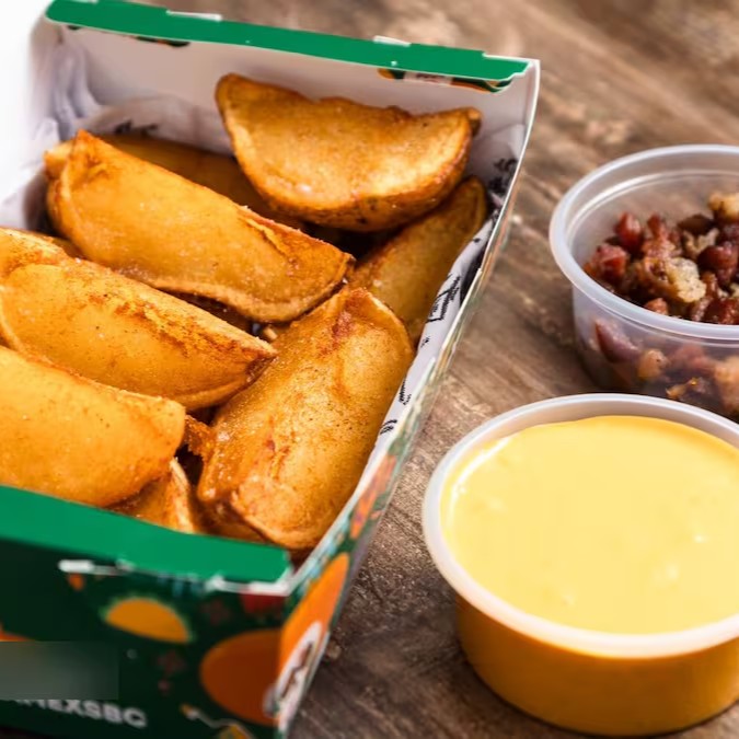Batata cozida e frita, você pode escolher acrescentar com cheddar e bacon na faixa.
