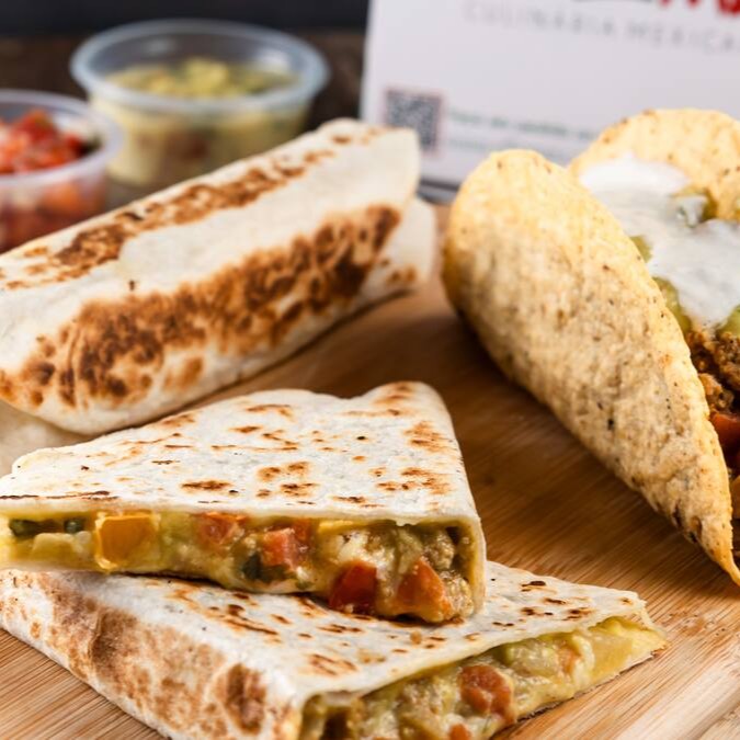 01 Quesadilla (média) +01 taco com recheios a sua escolha, 01 sobremesa e 01 Bebida.